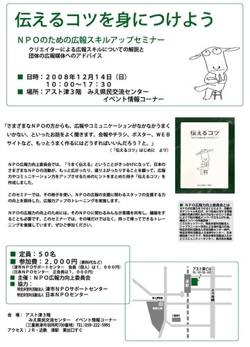 こんにちは。スタッフのとしこ(仮)改め、くずまきです。 明日はいよいよ、全国のNPOでも有名な 「伝えるコツを身につけよう ~NPOのための広報スキルアップセミナー~」 が、三重で開催されます! 今年は、鳥取、栃木、香川、京都、青森、三重、佐賀、東…