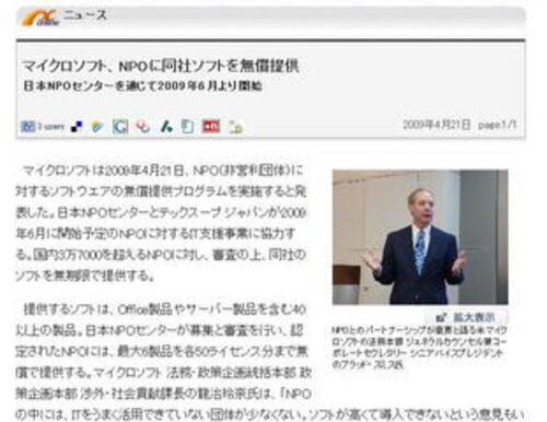 こんにちは。カワキタです。 「津のこと」で、しまさんが書いていましたが、マイクロソフトが、日本NPOセンターを通じて、NPOにソフトの無償提供をするらしいです。 【記事】 http://pc.nikkeibp.co.jp/article/news/20090421/1014477/ 結構前からそう…