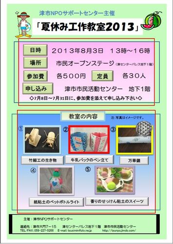 こんにちは 今日は朝から雨。 キラキラ太陽が待ち遠しいですね さて、この梅雨が終われば夏 夏と言えば夏休み 早く夏休みにならないかな~と思っているお子さんもおおいでしょうね。 津市NPOサポートセンターでは「夏休み工作教室2013」を開催します。 …