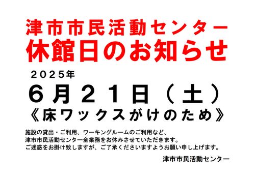 いつも津市市民活動センターをご利用いただきありがとうございます。津市市民活動センターは床ワックスがけのため、2025年6月21日(土)は終日休館いたします。施設の貸出・ご利用、ワーキングルームのご利用など、津市市民活動センター全業務をお休みさせて…