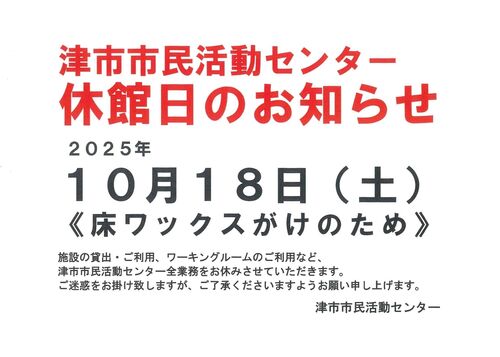 いつも津市市民活動センターをご利用いただきありがとうございます。 津市市民活動センターは床ワックスがけのため、2025年10月18日(土)は終日休館いたします。 施設の貸出・ご利用、ワーキングルームのご利用など、津市市民活動センター全業務をお休みさせ…