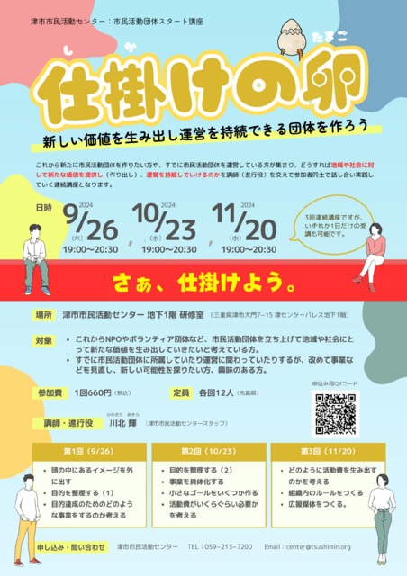 これから新たに市民活動団体を作りたい方や、すでに市民活動団体を運営している方が集まり、どうすれば地域や社会に対して新たな価値を提供し(作り出し)、運営を持続していけるのかを講師(進行役)を交えて参加者同士で話し合い実践していく連続講座となります。